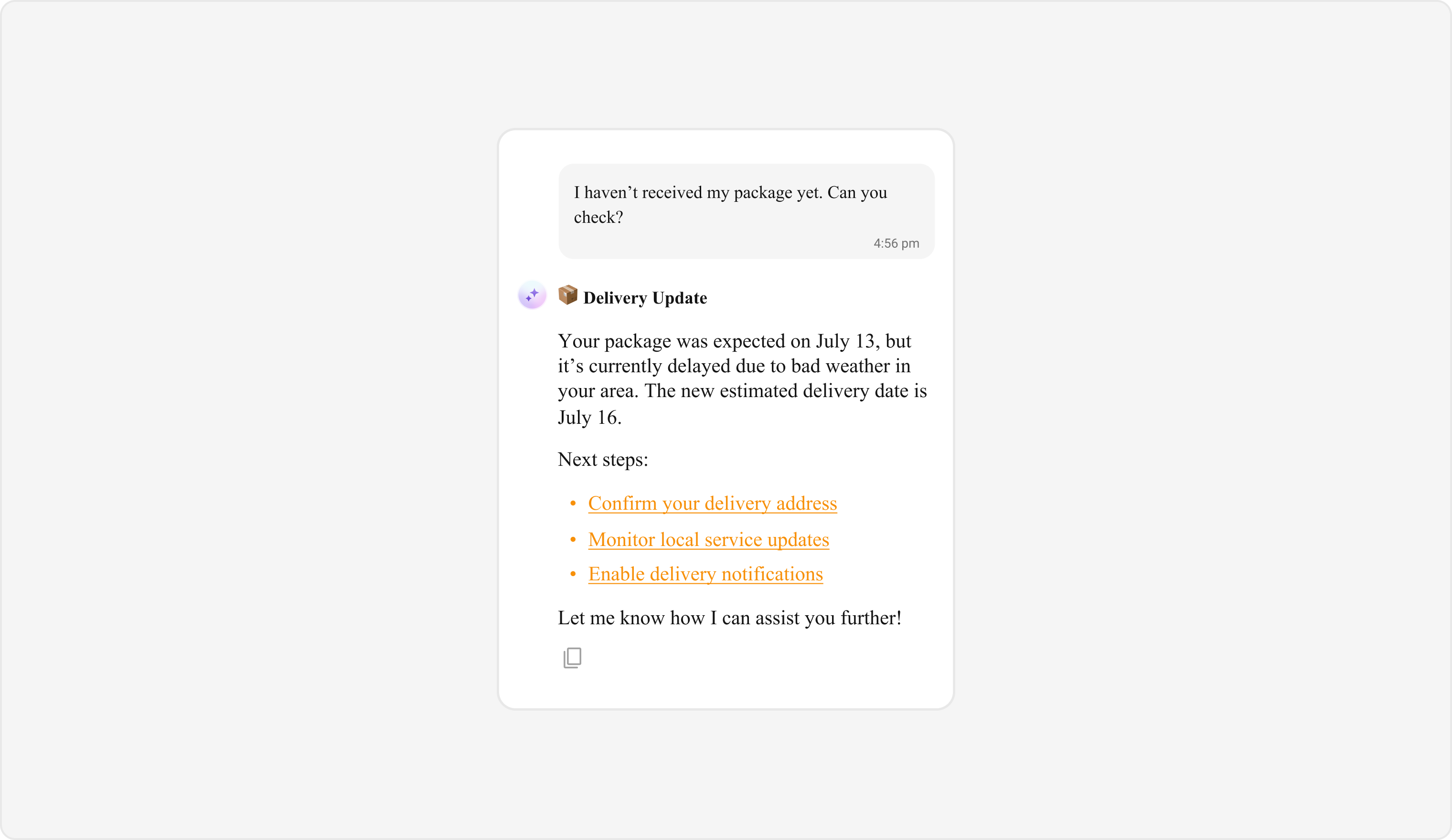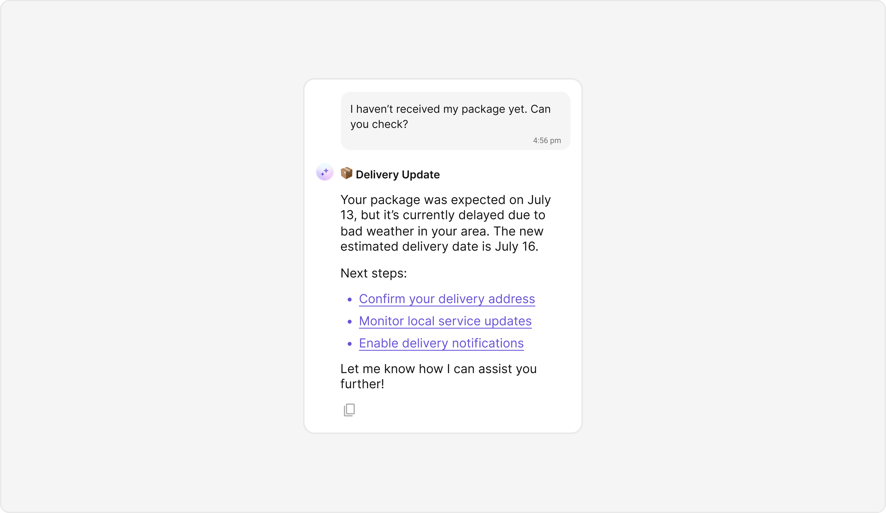 AI Assistant bubbles display messages and interactions from an AI assistant within the chat interface. Default