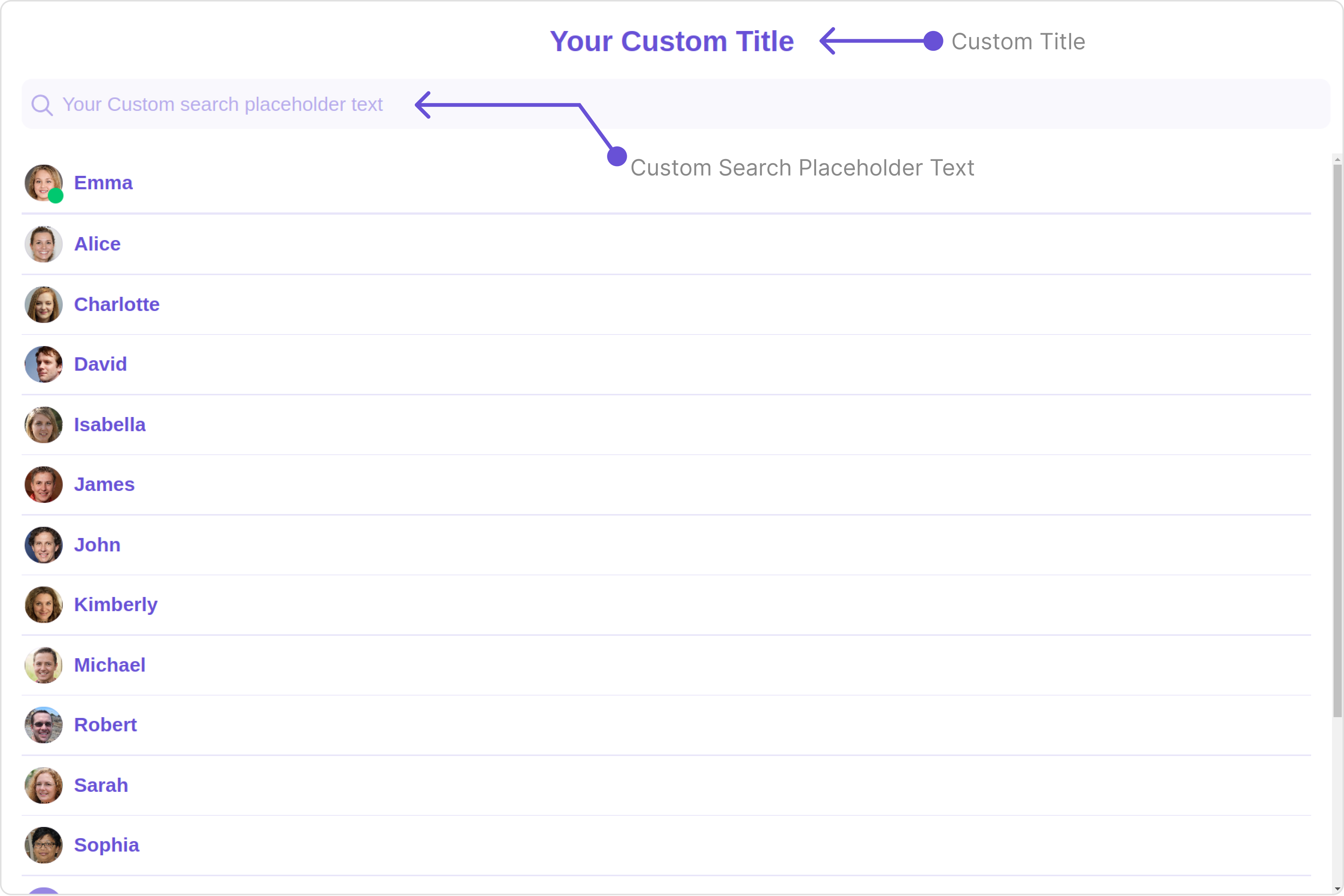 To fit your app’s design requirements, you can customize the appearance of the Users component. We provide exposed methods that allow you to modify the experience and behavior according to your specific needs.